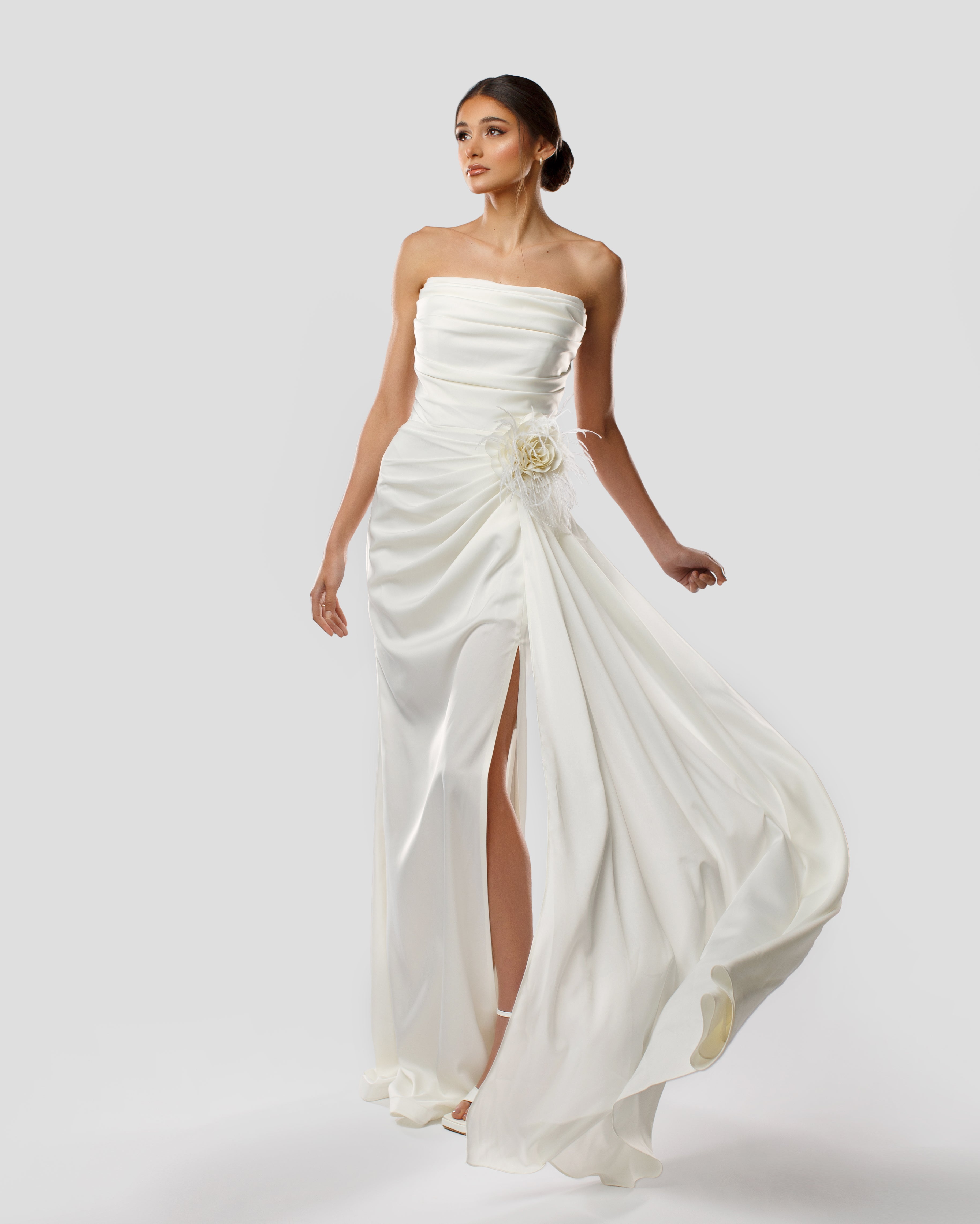 Strapless White Bridal Long Dress with Floral-Appliqué Feather-Trim